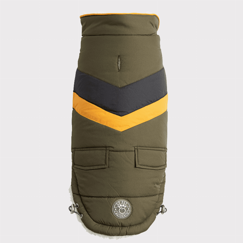 The GF Pet Alpine Puffer is a great choice for active dogs who are looking for carefree fashion and warmth. It's a modern take on a retro chevron design, with faux pockets and next-generation styling. With GF Pet signature contrast piping and snuggly-warm, popcorn Sherpa lining, the Alpine Puffer keeps it real. Water repellent and super-adjustable, with patented Elasto-Fit technology, this coat is designed to keep dogs looking cool while staying warm.