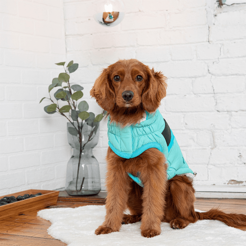 The GF Pet Alpine Puffer is a great choice for active dogs who are looking for carefree fashion and warmth. It's a modern take on a retro chevron design, with faux pockets and next-generation styling. With GF Pet signature contrast piping and snuggly-warm, popcorn Sherpa lining, the Alpine Puffer keeps it real. Water repellent and super-adjustable, with patented Elasto-Fit technology, this coat is designed to keep dogs looking cool while staying warm.