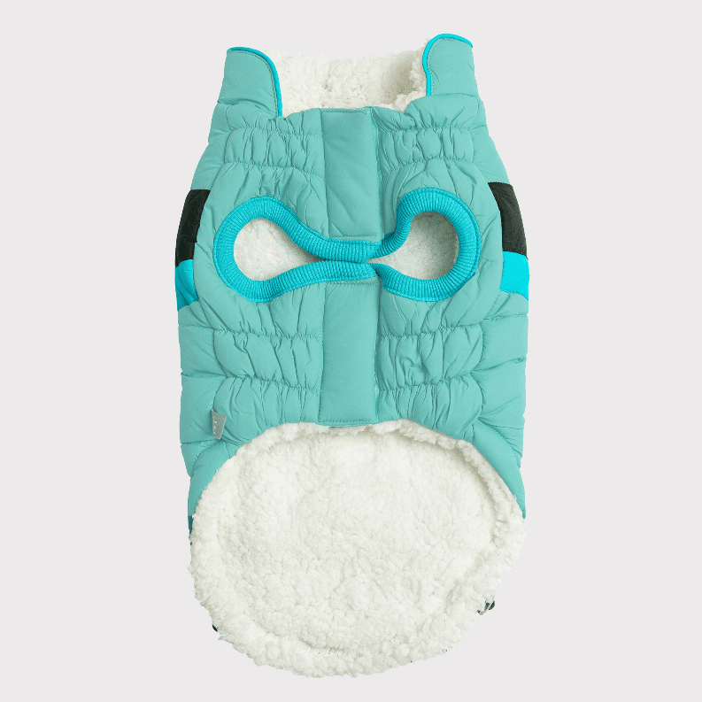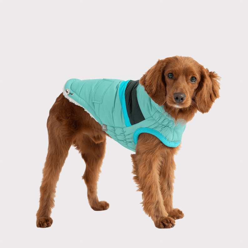 The GF Pet Alpine Puffer is a great choice for active dogs who are looking for carefree fashion and warmth. It's a modern take on a retro chevron design, with faux pockets and next-generation styling. With GF Pet signature contrast piping and snuggly-warm, popcorn Sherpa lining, the Alpine Puffer keeps it real. Water repellent and super-adjustable, with patented Elasto-Fit technology, this coat is designed to keep dogs looking cool while staying warm.