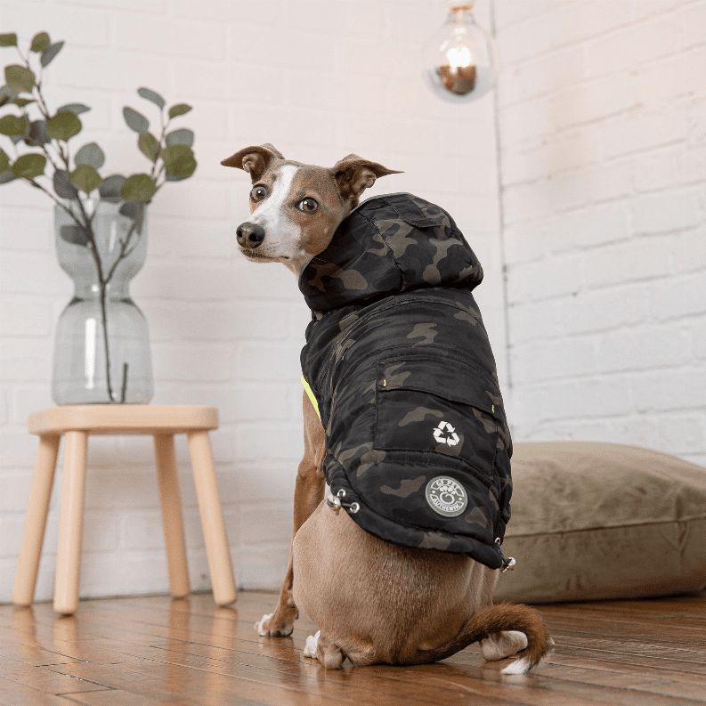 The GF Pet Recycled Parka is made from 100% recycled fabrics. The fabric used to make this sustainable parka is produced from recycled water bottles and is responsible, versatile, heritage-inspired and weather resistent. Enjoy the ever-stylish GF Pet signature contrast binding and accents. With its' tackable hood, practical real pocket and reflective piping, it will keep your dog protected and cozy. Super adjustable, with patented Elasto-Fit technology! For dogs and owners who are proud to support our planet.