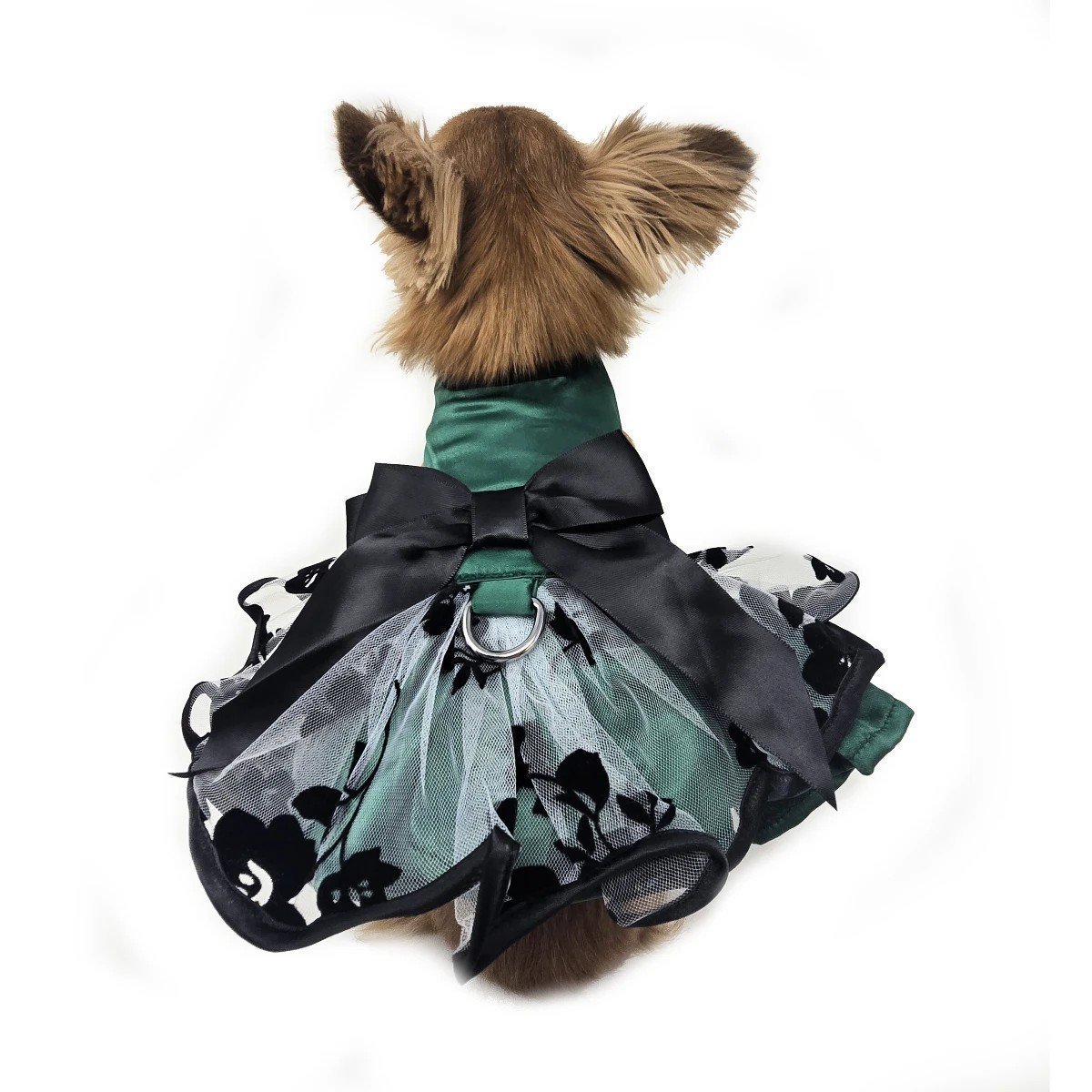Crafted with luxe satin in a vibrant green and accented with black velvet floral tulle, this dog dress delivers a look that’s equal parts graceful and bold. Black trim and a soft bow at the waist add definition and polish, while the included matching green leash completes the look. The integrated D-ring (sizes XS–L) or leash hole (XL) makes walk prep quick and fuss-free, because your pup’s style shouldn’t slow her down.
