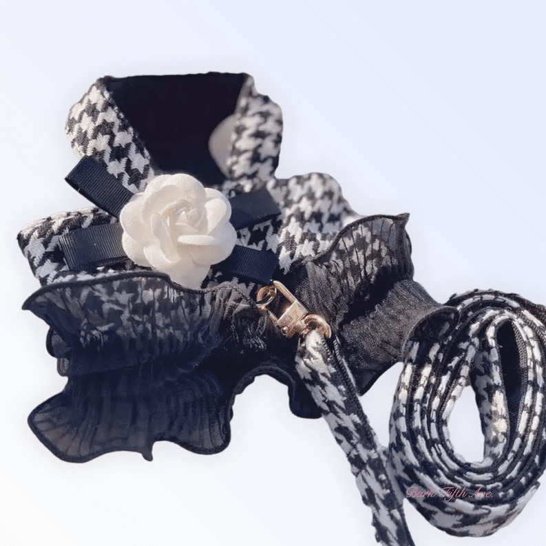 Chic and stylish! This gorgeous houndstooth harness and leash set are sure to impress! Featuring a ruffled tutu and classy camellia rose. Chest - Length   XS- 32 - 17     S- 36 - 21      M - 40 - 22       L- 44 - 25       XL- 50 - 28