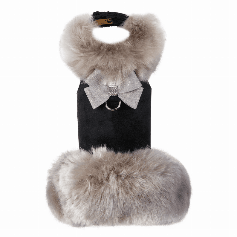 Our new favorite... The Glitzerati Collection! A hint of shimmer adds another level of beauty to the already gorgeous Ultrasuede. This foil like effect is embedded into the Ultrasuede so that none of this glitz will rub off or wash out. Just like our solid Ultrasuede's, use after use, wash after wash, this timeless winter coat will maintain it's beauty. Complete with fluffy faux fur lining and our signature nouveau bow, the underbelly hook and loop closure makes this coat an easy piece to throw on for colder nights. Imported from Japan, the luxurious Ultrasuede fabric is breathable, washable and colorfast. Attach your favorite leash to make this coat fashionable and functional. Like all of our products, this coat is made in the USA.