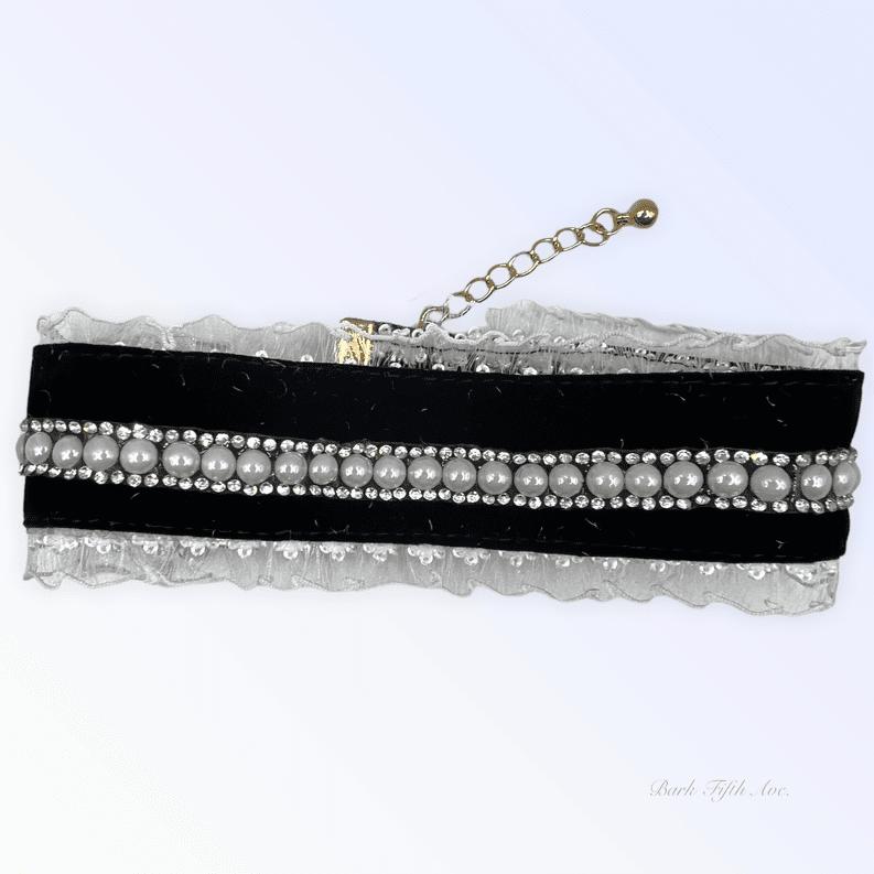 Classic and chic! The Black Velvet Necklace features delicate lace trim with a single rhinestone and pearl strand.Measures 2 inches wide.