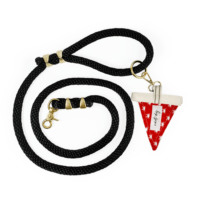 This svelt black lead features our adorable red crabby fabric flag. Our premium leashes are handmade from durable 5/8 super soft braided polypropylene and features solid brass hardware. A handy hardware ring on the handle keeps your Nauti-dog Handmade waste bag dispenser and wrist lanyard right within reach during trips out and about. Dont forget to make your nauti-pups new look complete with a complimenting collar and bandana-style collar cover accessories!