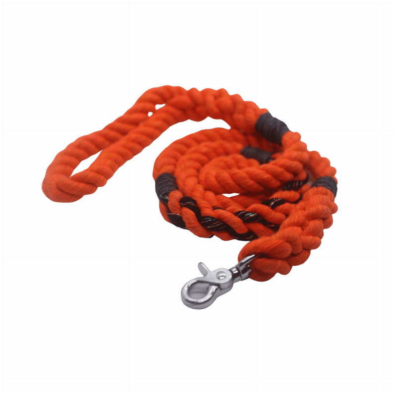 Our leashes are made of 100% cotton rope and colored using pet safe dyes. They are soft and comfortable, yet very durable. We use heavy duty bolt snaps that firmly secure your pet's collar. 100% cotton twine is used to secure all splices (loops) and is dyed to match your leash.