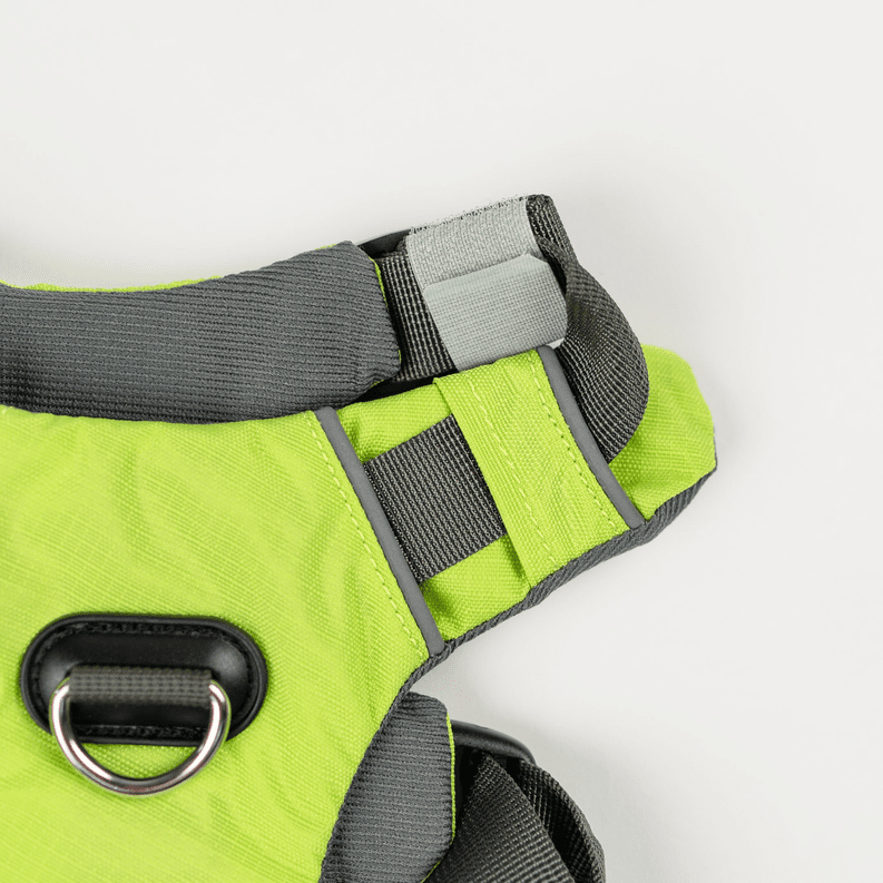 EZ Fit Straps with locking Velcro allows for quick adjustments. EZ Fit Buckles open for fast adjustment, then latch down to lock securely with remaining strap secured in rubber loops. In 10 seconds or less, all the adjustments are done and off you go. Triple stitching, top-quality padded comfort, and durability make this water-resistant harness the best in the world.