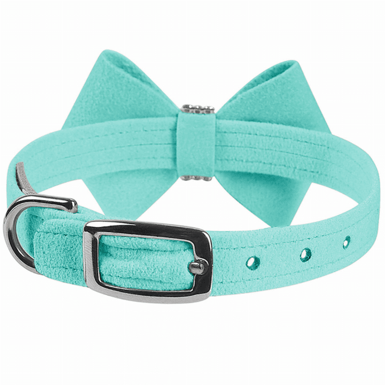 This Nouveau bow collar has a premium look and feel, while being easy for you to maintain. Made from Ultrasuede fabric with the soft texture and feel of premium suede. Ultrasuede offers the highest grade of durability, making this dog collar with bow resistant to stains and discoloration, it is even machine washable! The Nouveau bow captures all attention with bold curves embraced by rows of the world's finest crystals made in Europe. We recommend your dog should always be walked with a harness. Our bow collars for dogs are designed for ID tags, charms and for decoration, they are NOT designed for pulling dogs. Collar width is 0.5". Manufactured in the USA