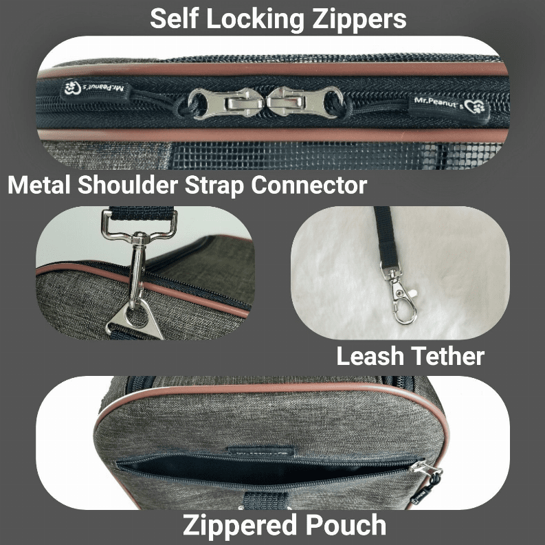 • Premium Brand Auto Self Locking Zippers for safety and eliminating the need for fragile clasps as the tote cannot be pushed open by your pet from the inside