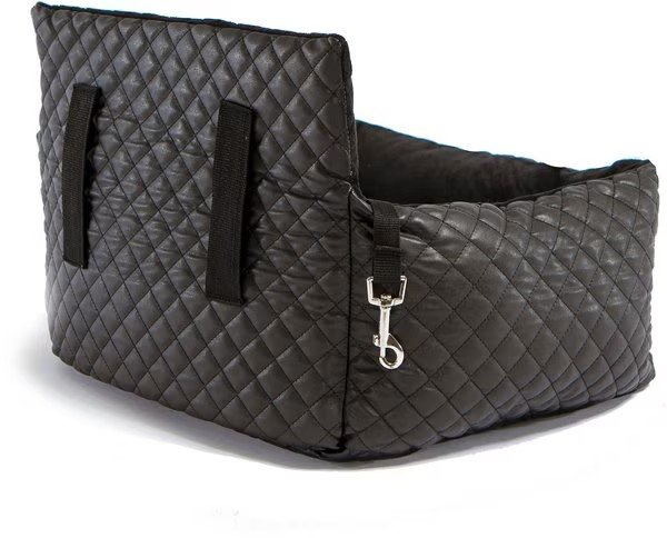A cushy car seat, in sleek faux leather, for pampered pups and drives together...
