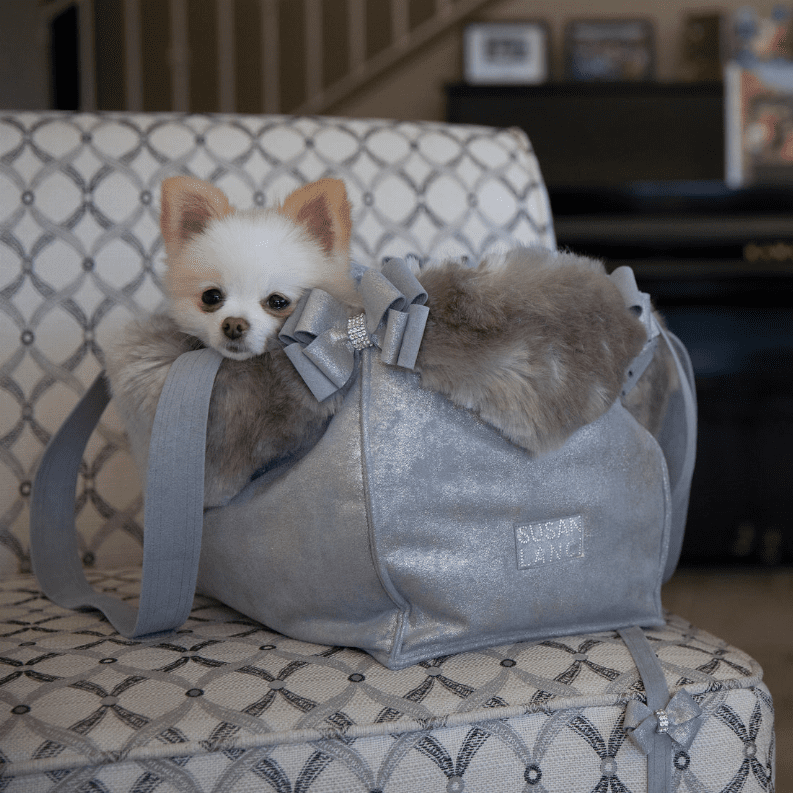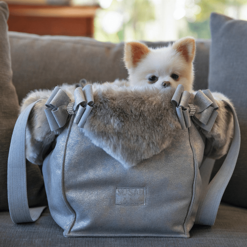 Susan Lanci Designs Platinum Glitzerati Double Nouveau Bow Luxury Carrier with Fur Trim